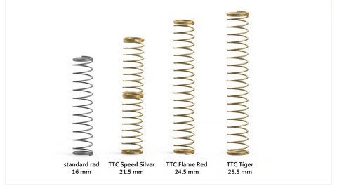 2, It is easy to notice that the length of Tiger switch spring double the traditional MX red. The super long string will give you a strong rebound. Moreover, both of them are pre-lubed, just like other TTC switches, particularly around the bottom of the slider rails on the stems and the legs at the points where they touch the switches’ leaves.