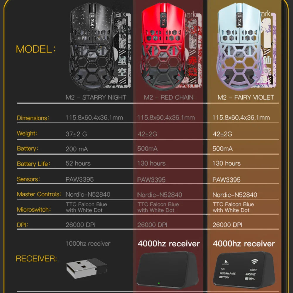 Presenting the all-new Darmoshark M2 DAREO 4K wireless gaming mouse. Available in two different variants, this is actually the lightest gaming mice in the market today weighing in at just 36 grams for the Air variant and 39 grams for the normal variant. Loaded with premium quality components such as NORDIC 52840 main control chipset, PAW3395 sensor, TTC Micro-Motion Switches, TTC Wheel encoder, etc. the Darmoshark M2 Dareo offers an outstanding user experience with lag-free and silky smooth tracking and excellent accuracy!!