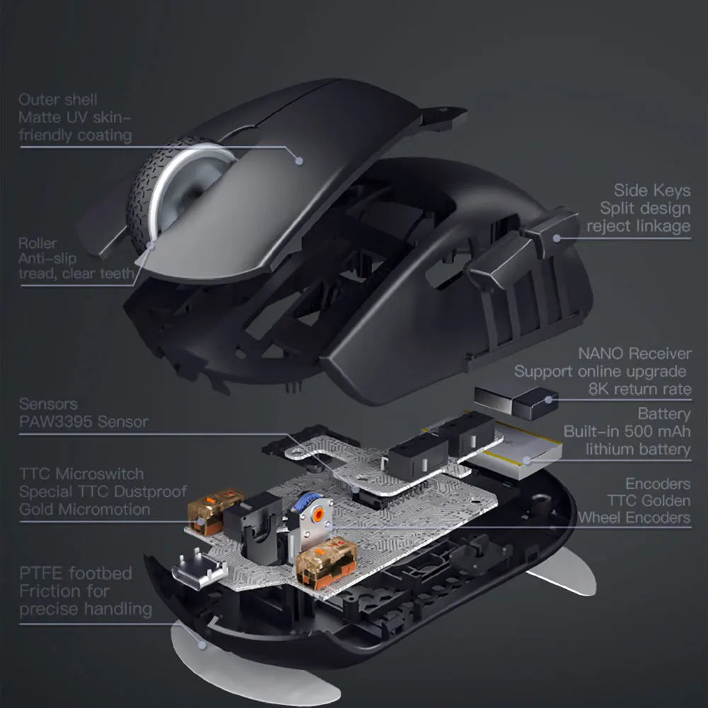 Right next to the flagship PAW3395 sensor, we have NORDIC 52840 high-end master control chipset. It provides efficient power management as well as connectivity ensuring stable 8K wireless 2.4GHz connectivity with no lag whatsoever. It also maintains better battery management even at such high connectivity rates.