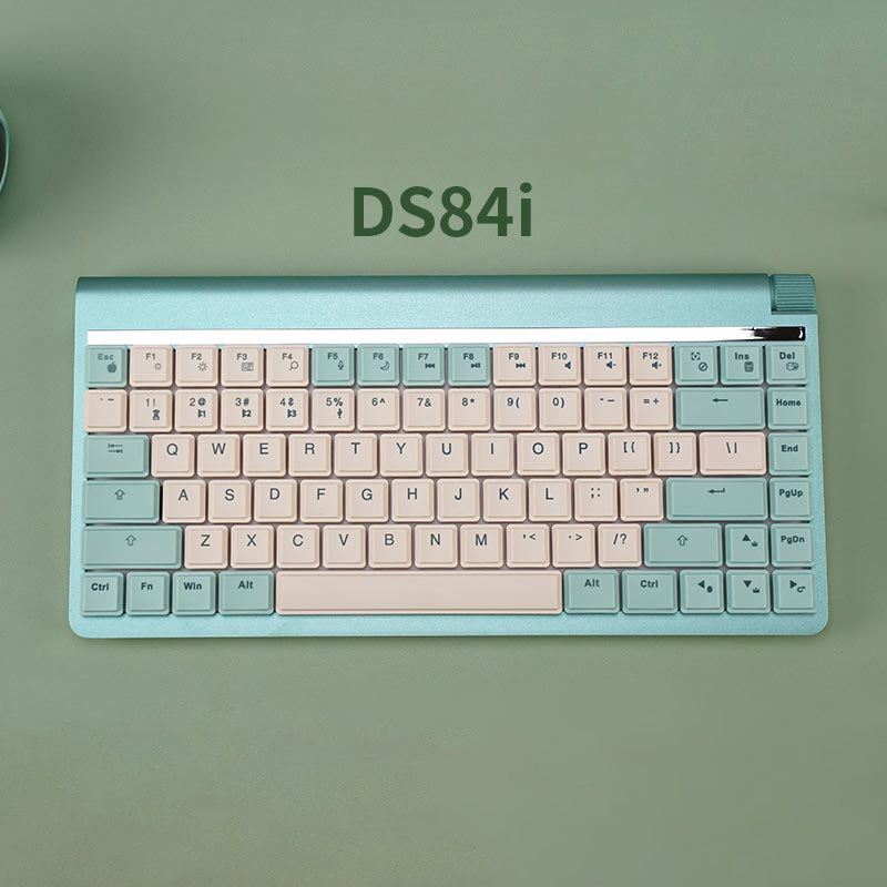 Double Shell DS84i is a low-profile three-mode mechanical keyboard designed with an improved version of the classic Apple Magic keyboard. The keyboard offers comfortable typing feedback with its low-profile design, ladder-shaped PBT material keycaps, and low-profile mechanical switches. It has an indicator light strip which glows in different colors to show the active settings on the keyboard. We also have a multi-function knob that can be used to adjust the volume or brightness on the keyboard.
