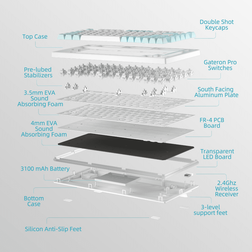 The YZ75 is a 75% layout 82-key mechanical gaming keyboard. Come with an acrylic metal badge, the keyboard offers both functionality and aesthetic. The keyboard takes a Gateron G Pro switch and pre-lubed stabilizers. Build-in double layers sound absorbing foams give the keyboard a premium typing experience. The YUNZII YZ75 is a 75% mechanical keyboard that is fully customizable and geared for mechanical keyboard enthusiasts.