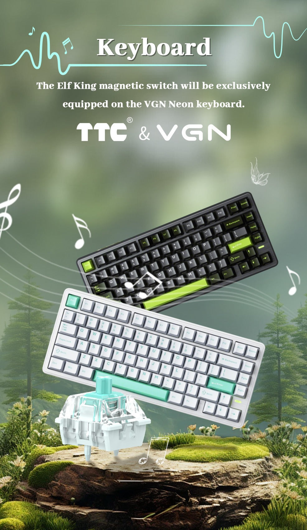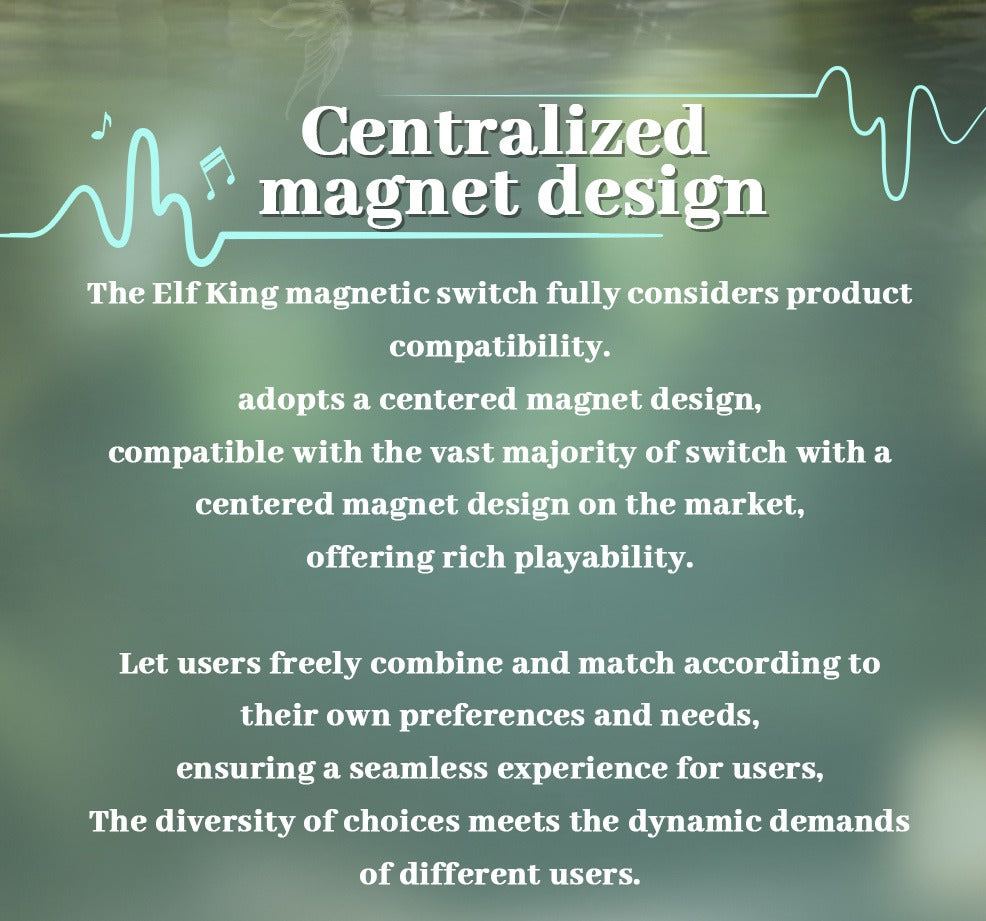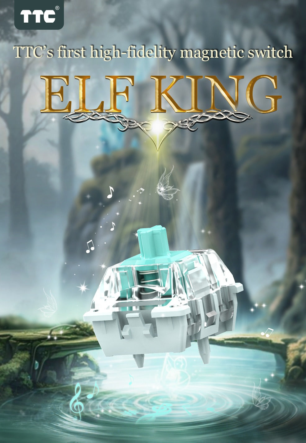 The TTC Elf King magnetic switch is a premium mechanical switch that blends aesthetics with high performance. Featuring a centralized magnet design, it ensures broad compatibility with most magnetic switch structures on the market, offering users rich customization and playability. With crisp and melodic acoustics and a smooth, responsive keystroke, it delivers a delightful typing experience. The switch showcases Tiffany blue accents and a built-in RGB light guide, creating a magical, immersive lighting effect.