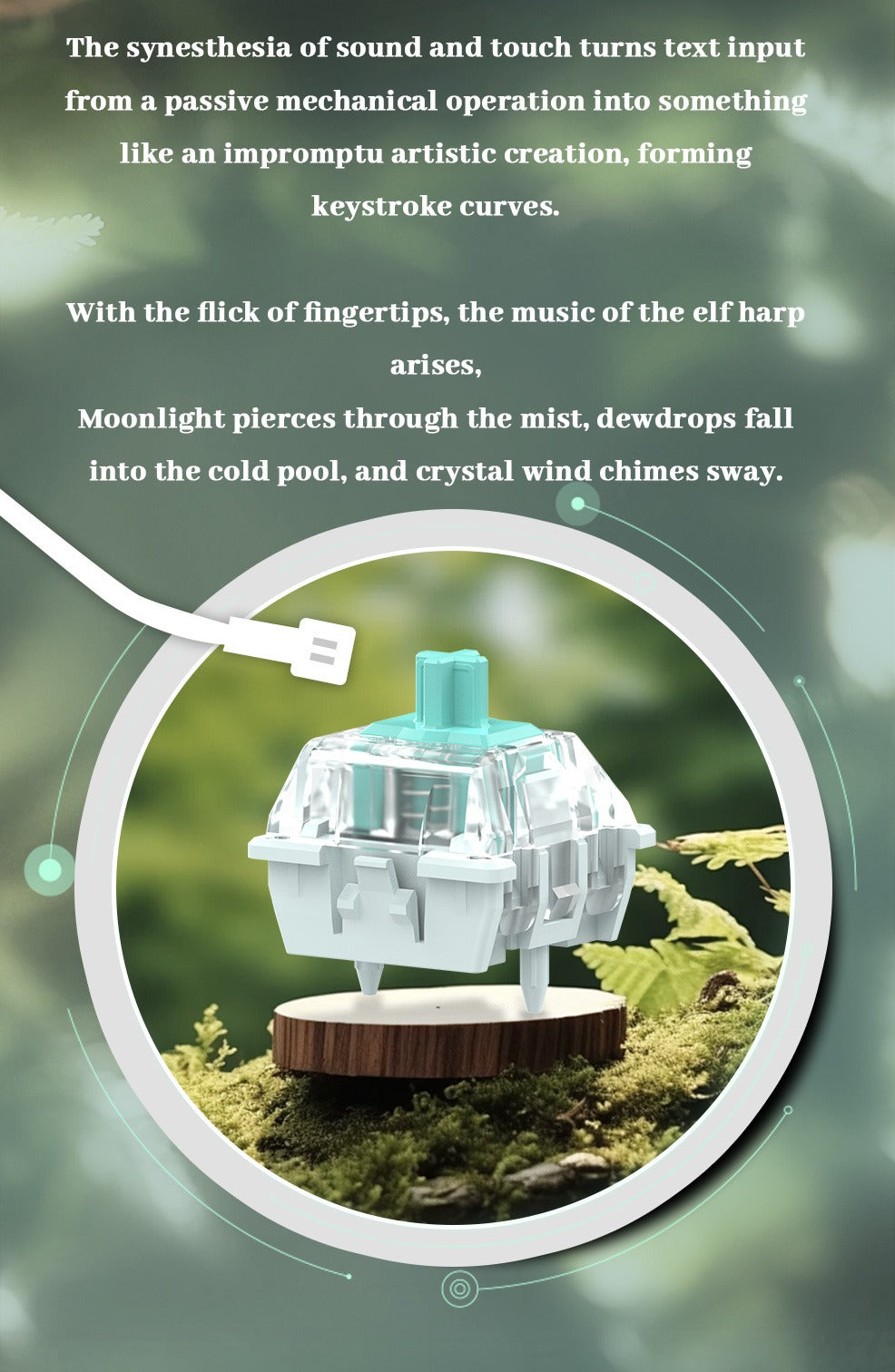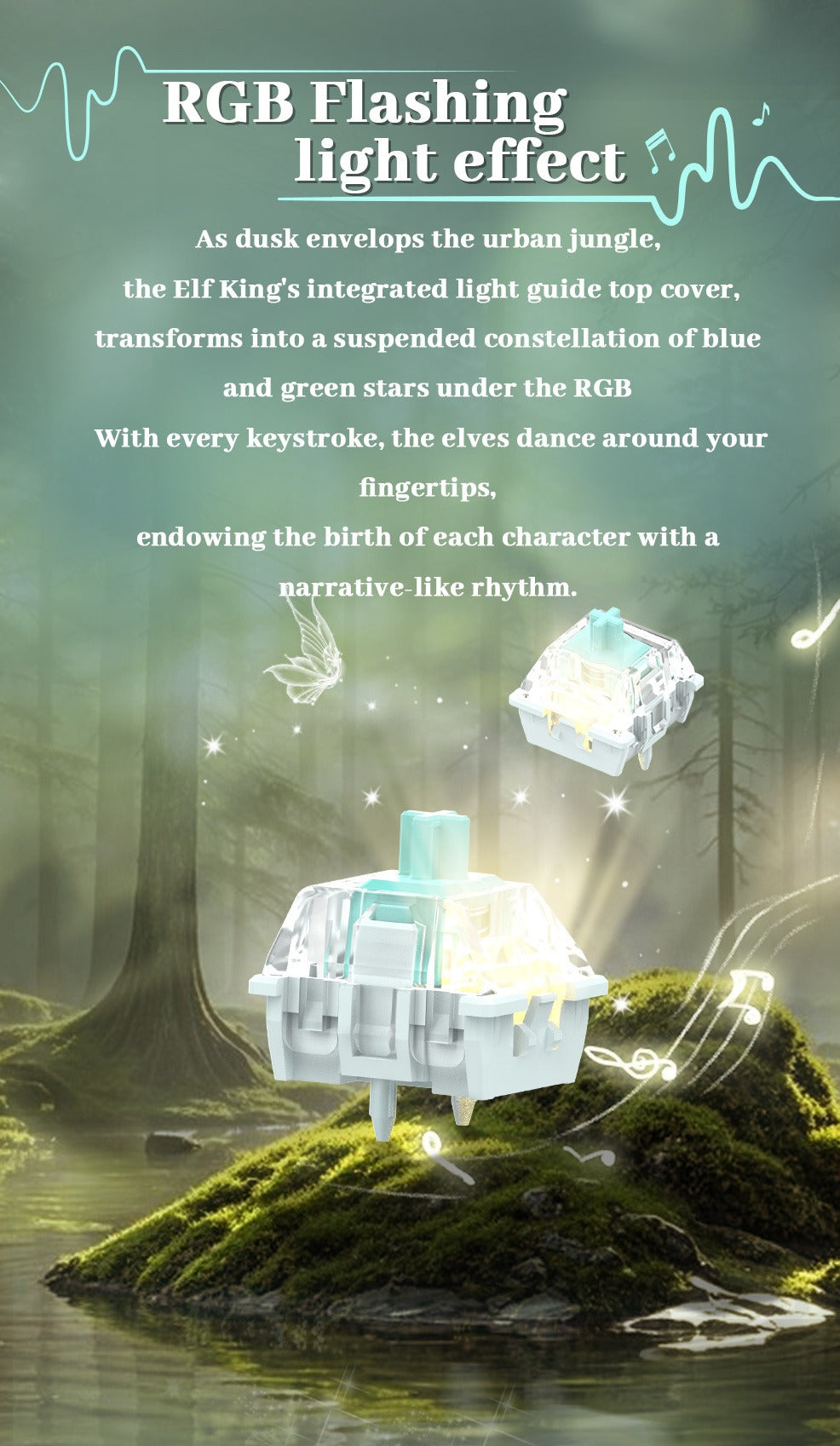 Its patented ventilation and heat dissipation structure effectively stabilizes performance during prolonged high-load use by minimizing thermal drift. Constructed with special materials, a 17mm spring, and sealed sleeves, the Elf King switch achieves a total travel of 3.4mm and supports up to 100 million keystrokes, ensuring long-lasting durability. Combining sound, touch, and visual brilliance, the Elf King is an ideal choice for gamers, creators, and enthusiasts seeking both performance and poetic design.