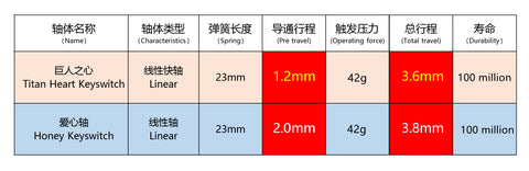 Compared with TTC Honey keyboard switch, the pre travel of Titan Heart mechanical keyswitch is 1.2mm, and the trigger efficiency is increased by 40%; The minimum initial pressure is 37g, which can effectively prevent accidental contact; The total travel is 3.6mm and the Honey keyswitch is 3.8mm. Titan Heart mechanical keyswitch is faster and more agile, which can effectively improve the operation efficiency.
